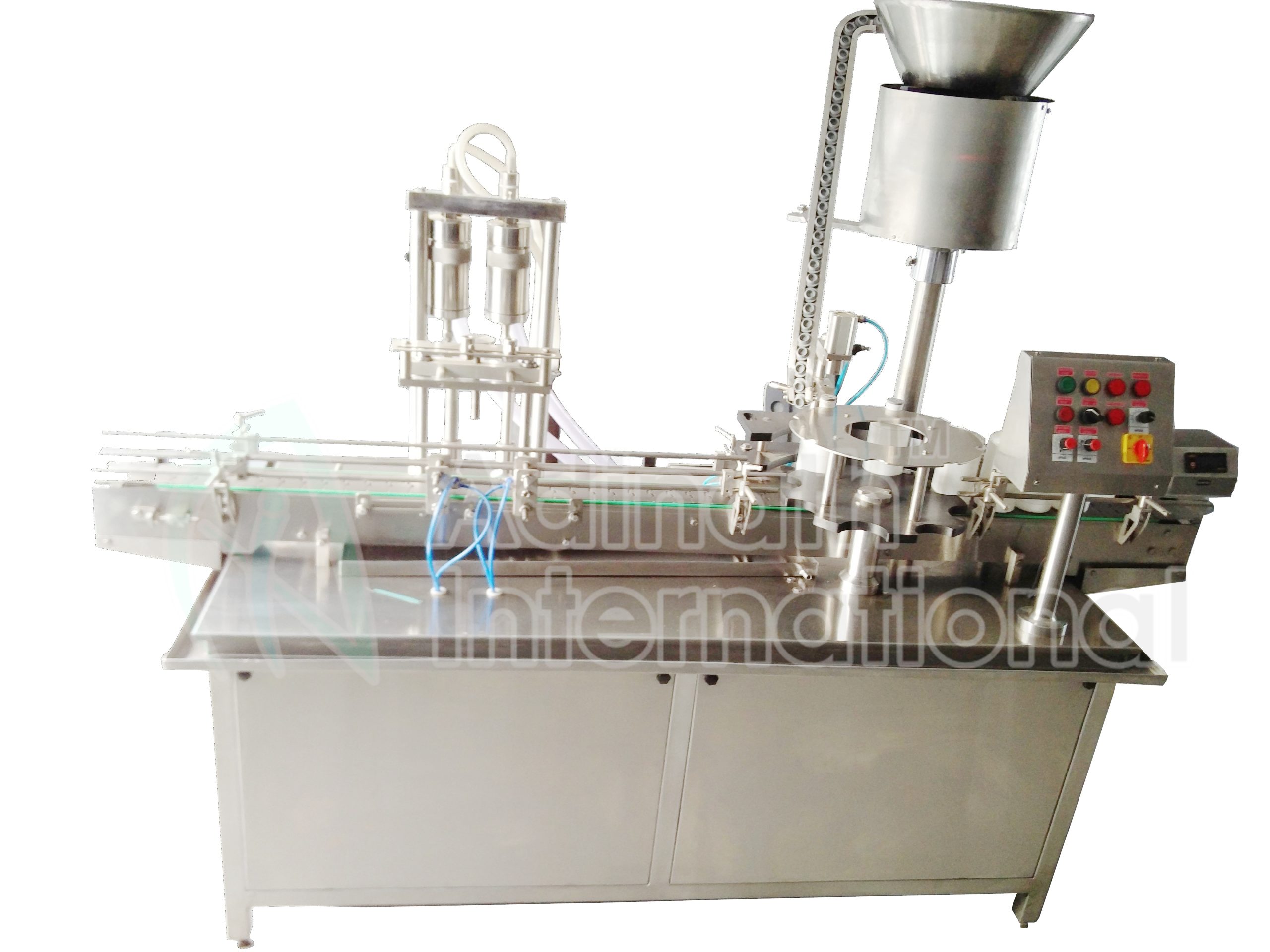 In-feed turn table deliver bottles one by one to the moving SS conveyor. Bottles come into the filling point through SS conveyor. Filling Nozzle fill pre set volume of liquid into the bottle. The hexagonal bolt dosing block allows using of different filling volume easily with minimum use of time. The main drive consists of a gearbox driven by A.C motor & through controlled by an AC Frequency drive. The speed can be set in terms of bottles per minute. The conveyor drive consists of a hallow shaft